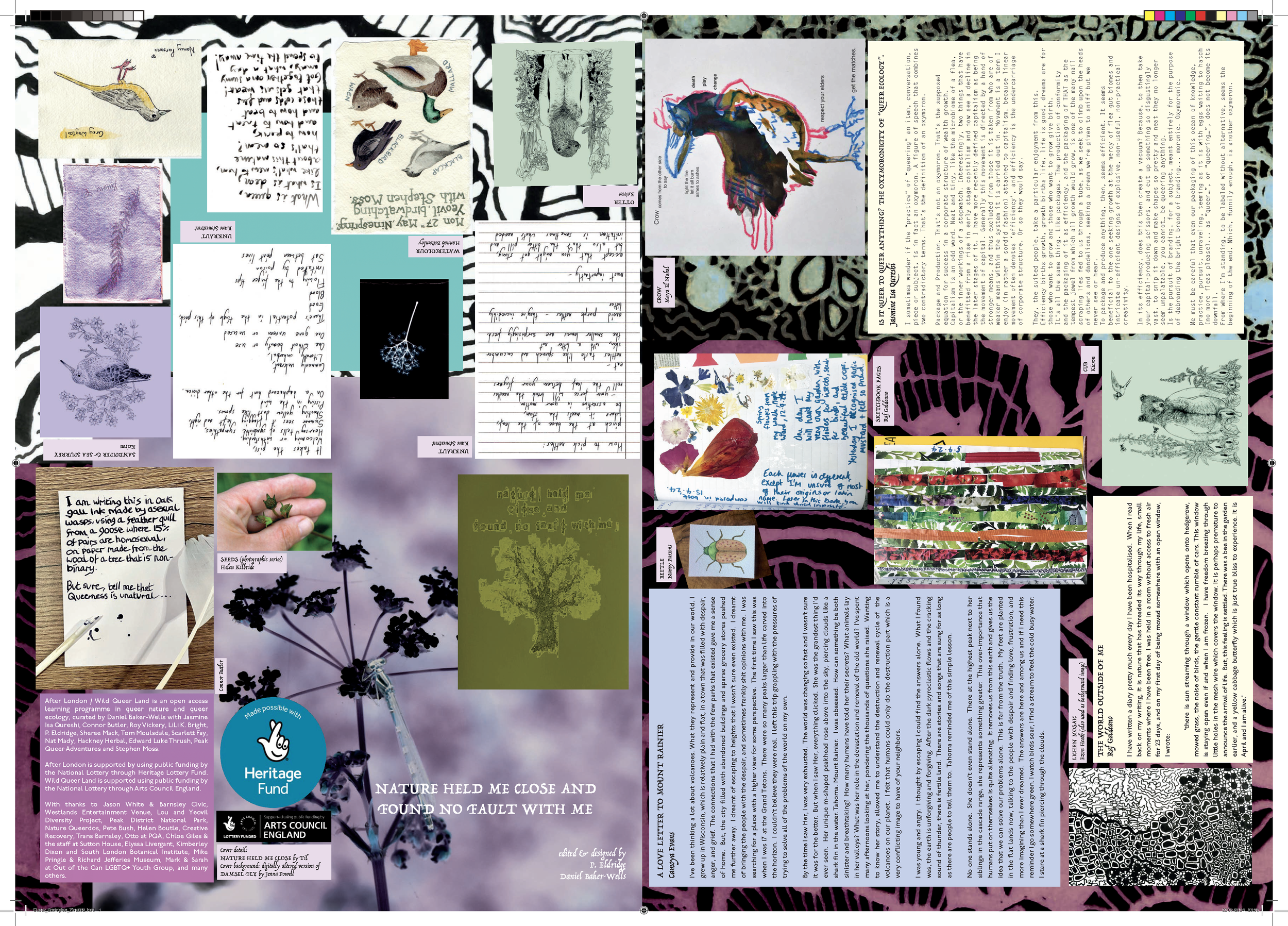 It explored ideas of queer nature. It was curated by Daniel Baker-Wells with artists, ecologists, poets, herbal healers, land workers and ornithologists: Jasmine Isa Qureshi, Connor Butler, Roy Vickery, LiLi K. Bright, P. Eldridge, Sheree Mack, Tom Moulsdale, Scarlett Fay, Hackney Herbal, Stephen Moss, Phoenix Yemi, Elida Silvey, Edward Luke Thrush, Golda Dahan and some incredible volunteers, freelancers, zine contributors and advisors.